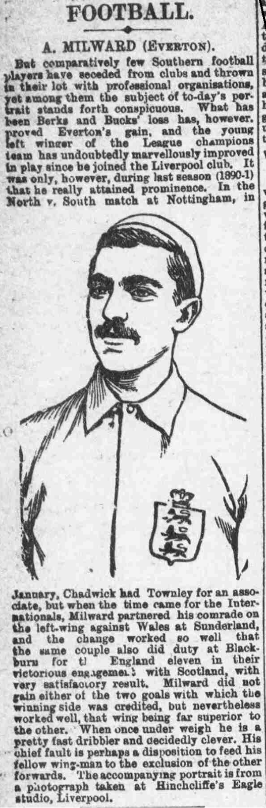 Joining Everton from Marlow in 1888, Alf Milward made 225 first team appearances for the Toffees in 9 seasons,scoring 95 goals. He then spent 1 season at New Brighton Tower before moving back south and playing for Southampton and New Brompton in the Southern League.