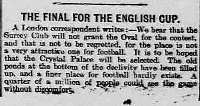 The change from The Oval was welcomed in most quarters- the popularity of the Final as a spectacle in the professional era having outgrown the cricket ground. The accommodation for spectators was limited by the playing area being in the cricket outfield. The cricket club were also concerned about damage to the turf.