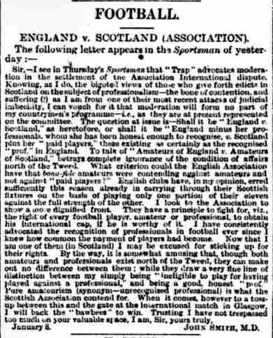In 1885 Dr John Smith was banned from playing for or against any Scottish club or the Scottish national team because he had played for Corinthians against professionals. In his outings for Corinth he usually employed the pseudonym J. Miller.